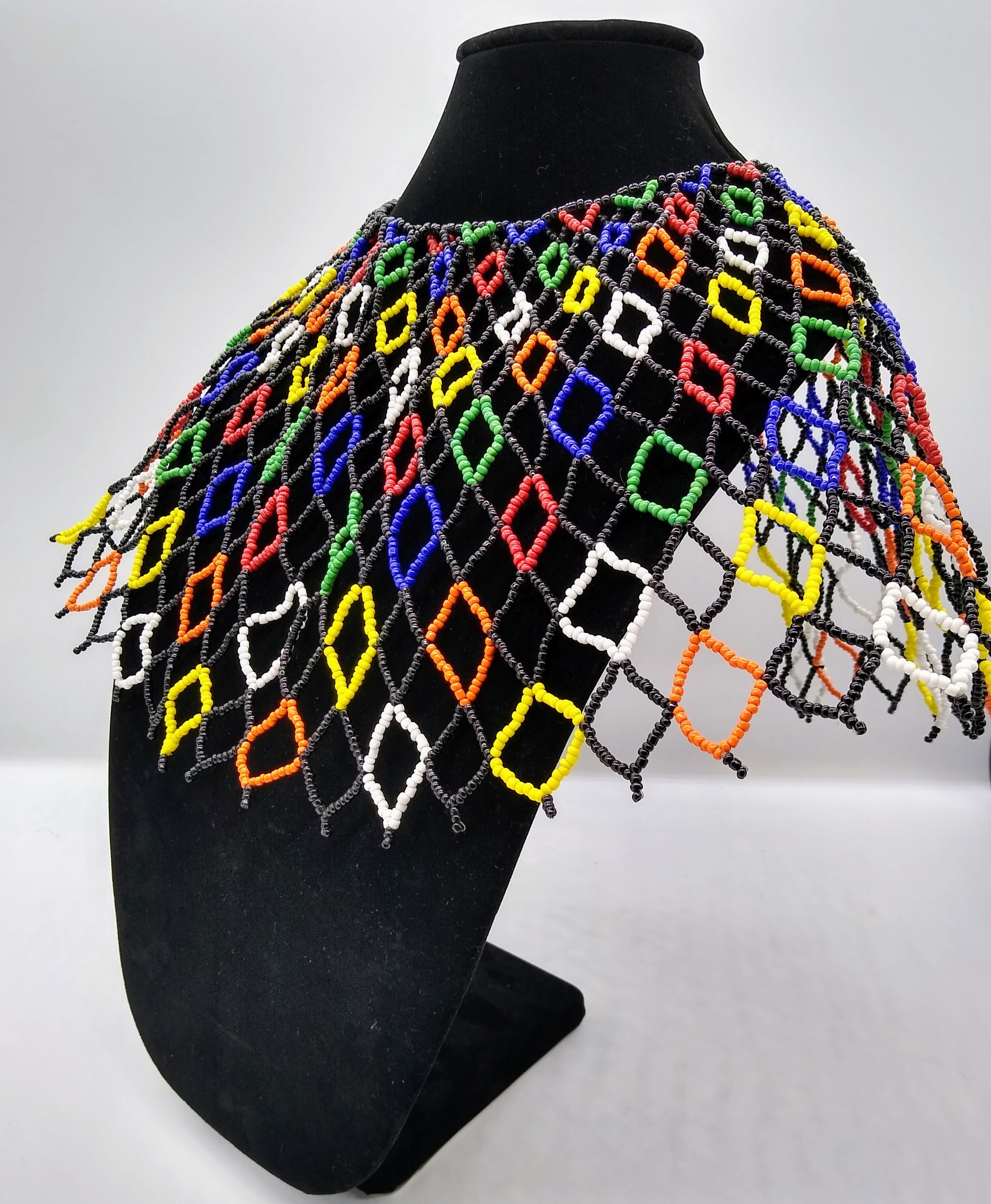 Vibrate colored beaded handmade necklaces that just slightly drapes over your shoulder and collarbone.