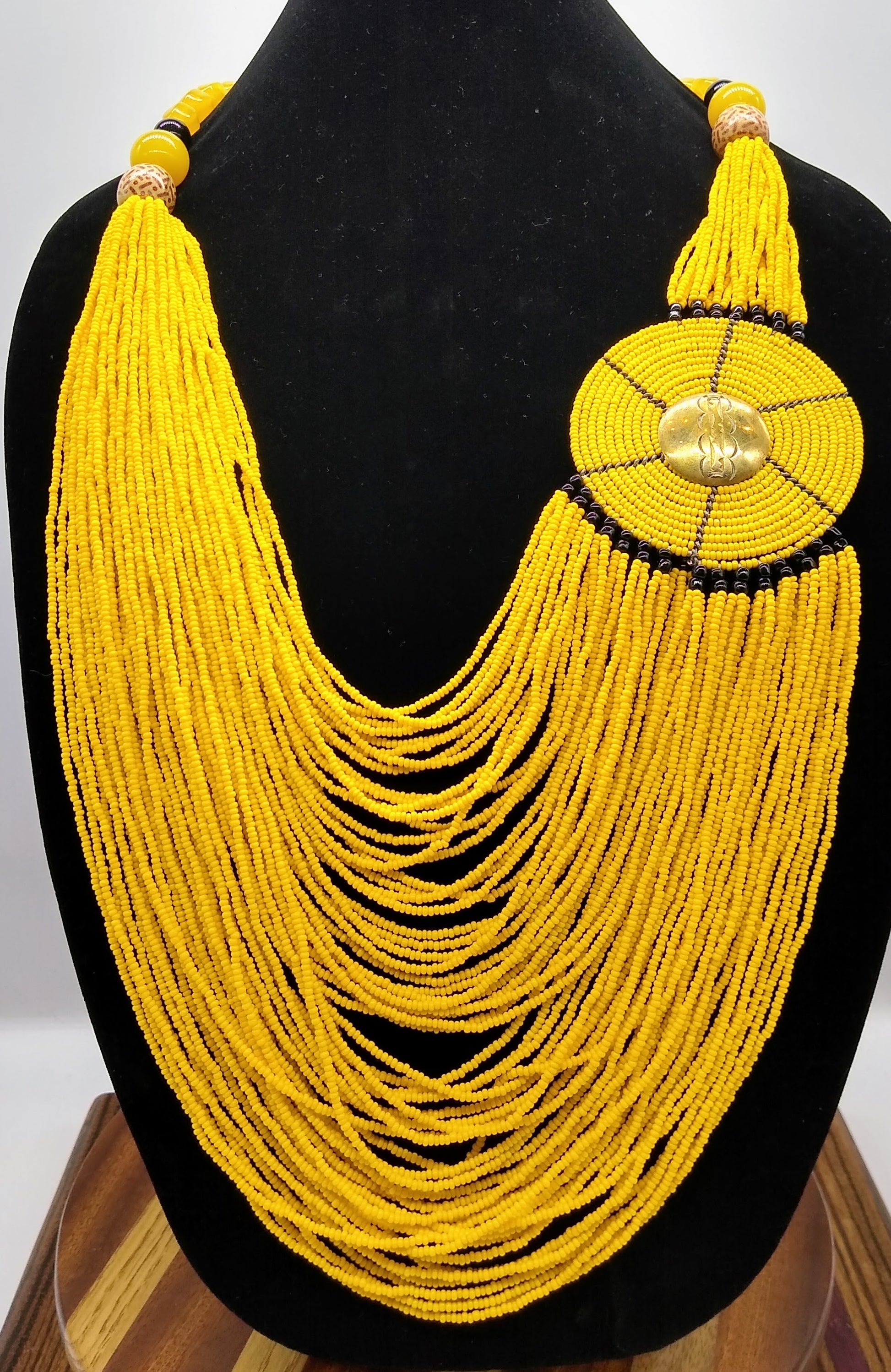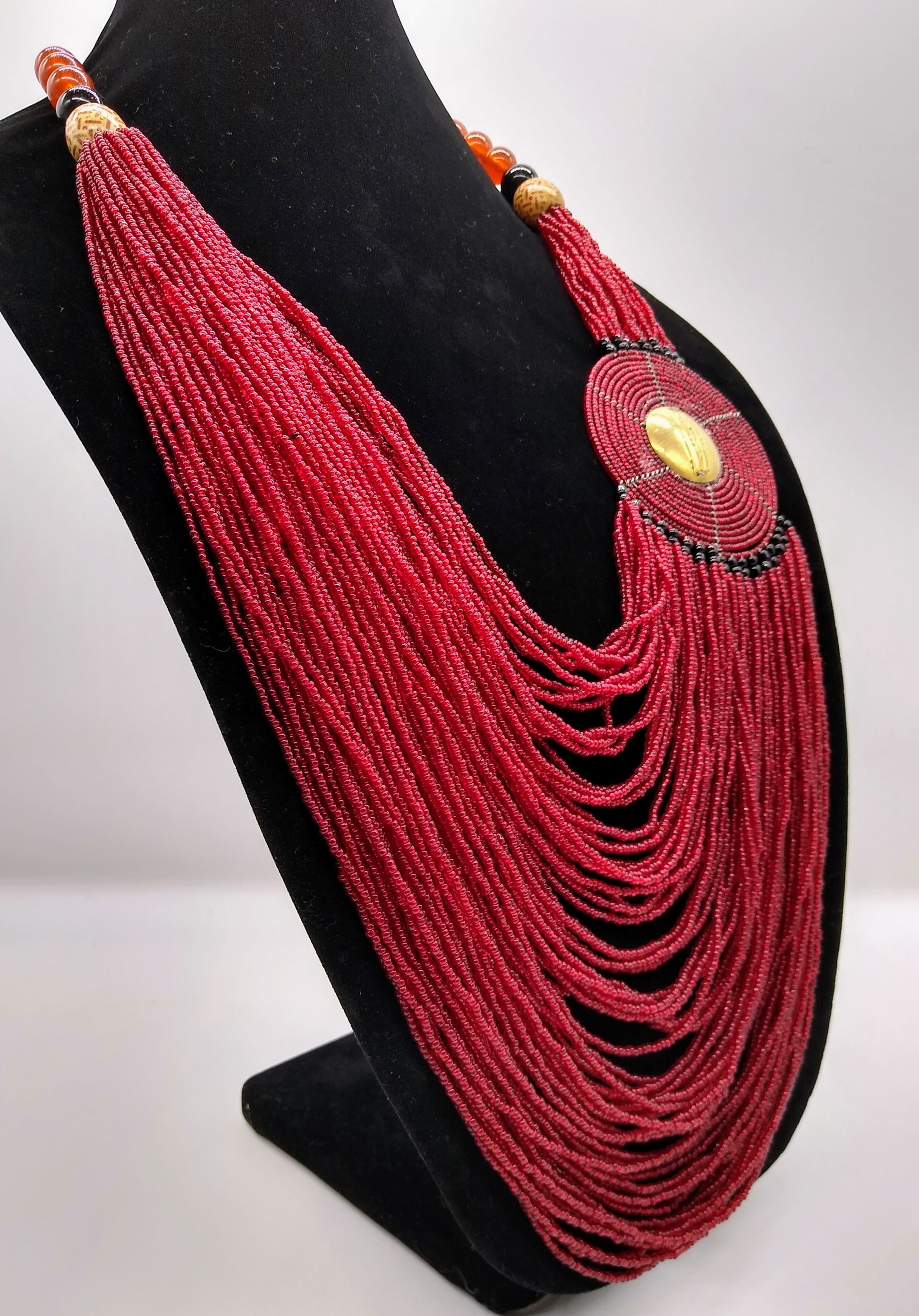 Handmade beaded necklace. Around the neck are larger beads that add another layer of style and in the bead work there is a beaded and woven pendant which truly makes this piece stand out.